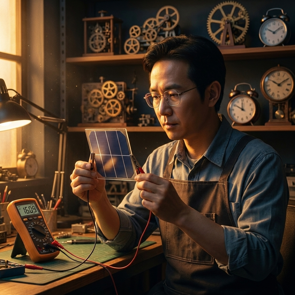 I'm writing this at my bench at 06:40, before the morning shift arrives, with a cup of tea I've let go slightly past temperature. In front of me is a small photovoltaic test cell. It is a remarkable piece of nothing — a square of coated glass about the size of a playing card, held between two clips, trailing two thin wires into a multimeter. The multimeter says it is producing 0.89 volts. I've run the same test six times this week. It keeps producing 0.89 volts. What makes this interesting is that the cell is, by most classical definitions of the word, defective.