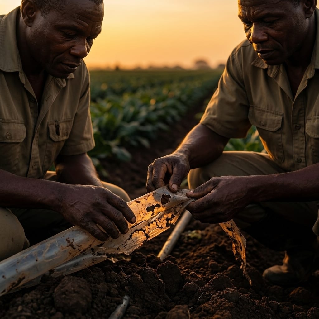The irrigation tubing we buried three years ago — high-density polyethylene, rated for a decade of continuous use — had a section where the wall had gone thin and porous, like old paper. I pulled it up, and the piece crumbled between my fingers. Fumiko was standing behind me with a soil probe and said, very calmly, “That’s not UV degradation.”